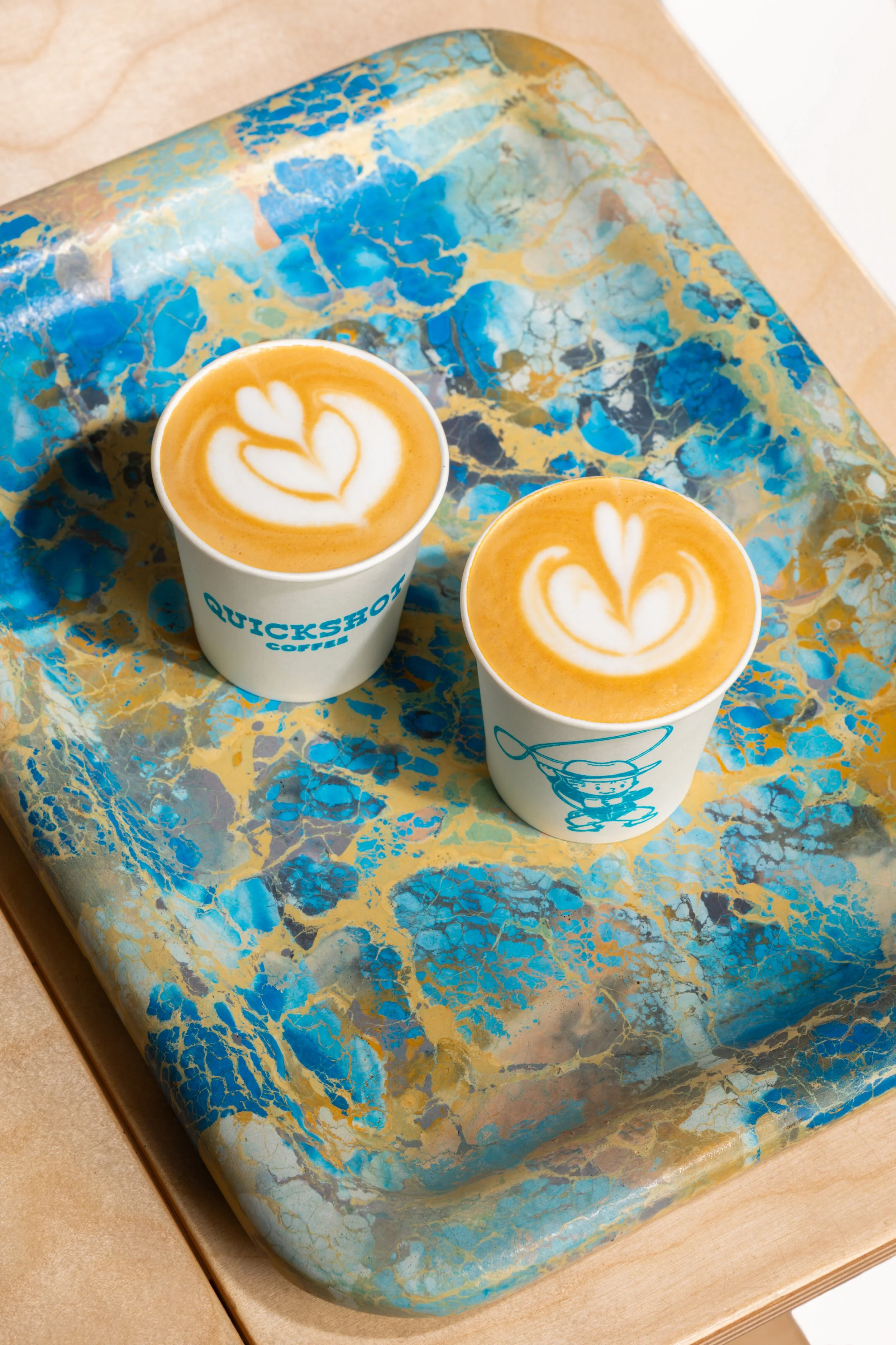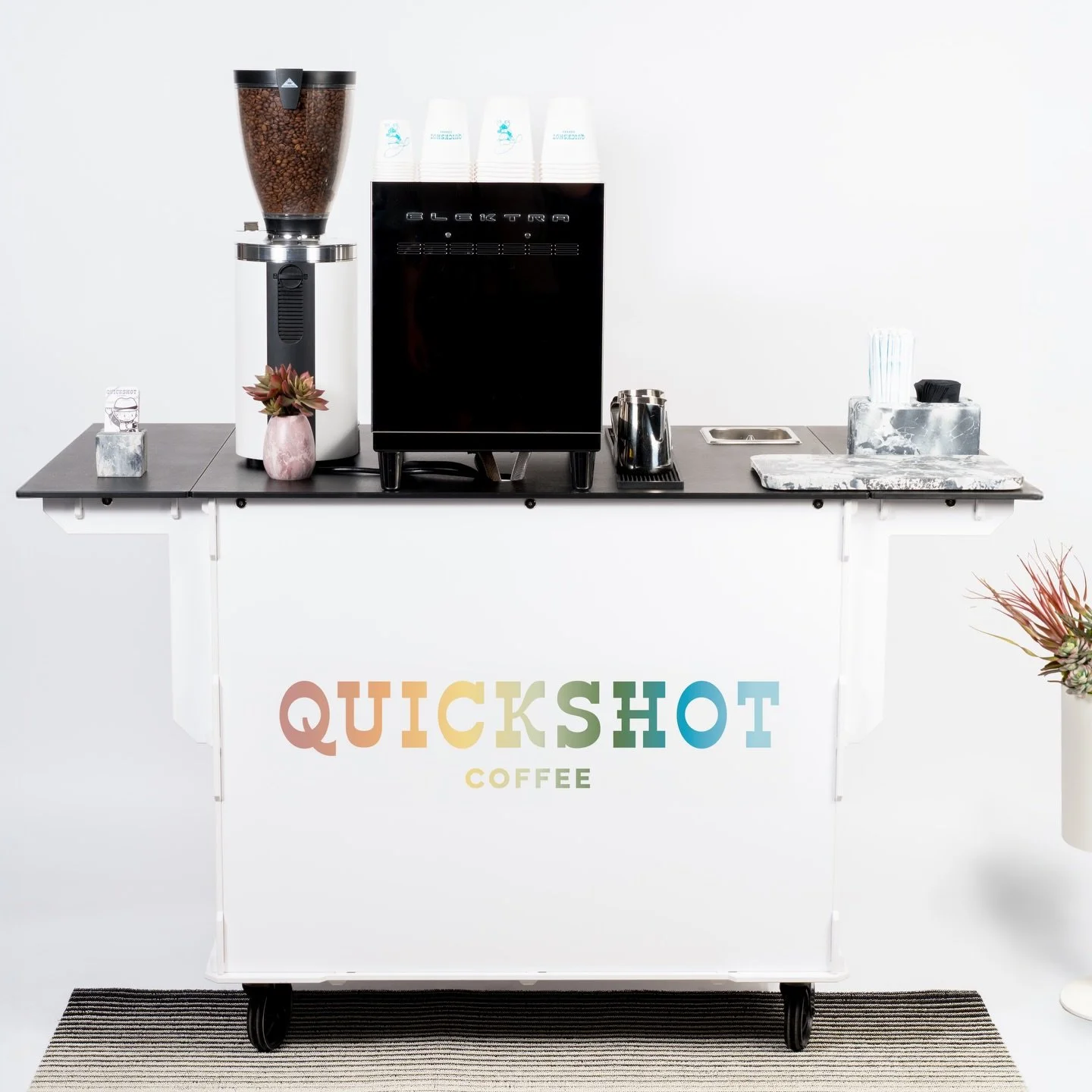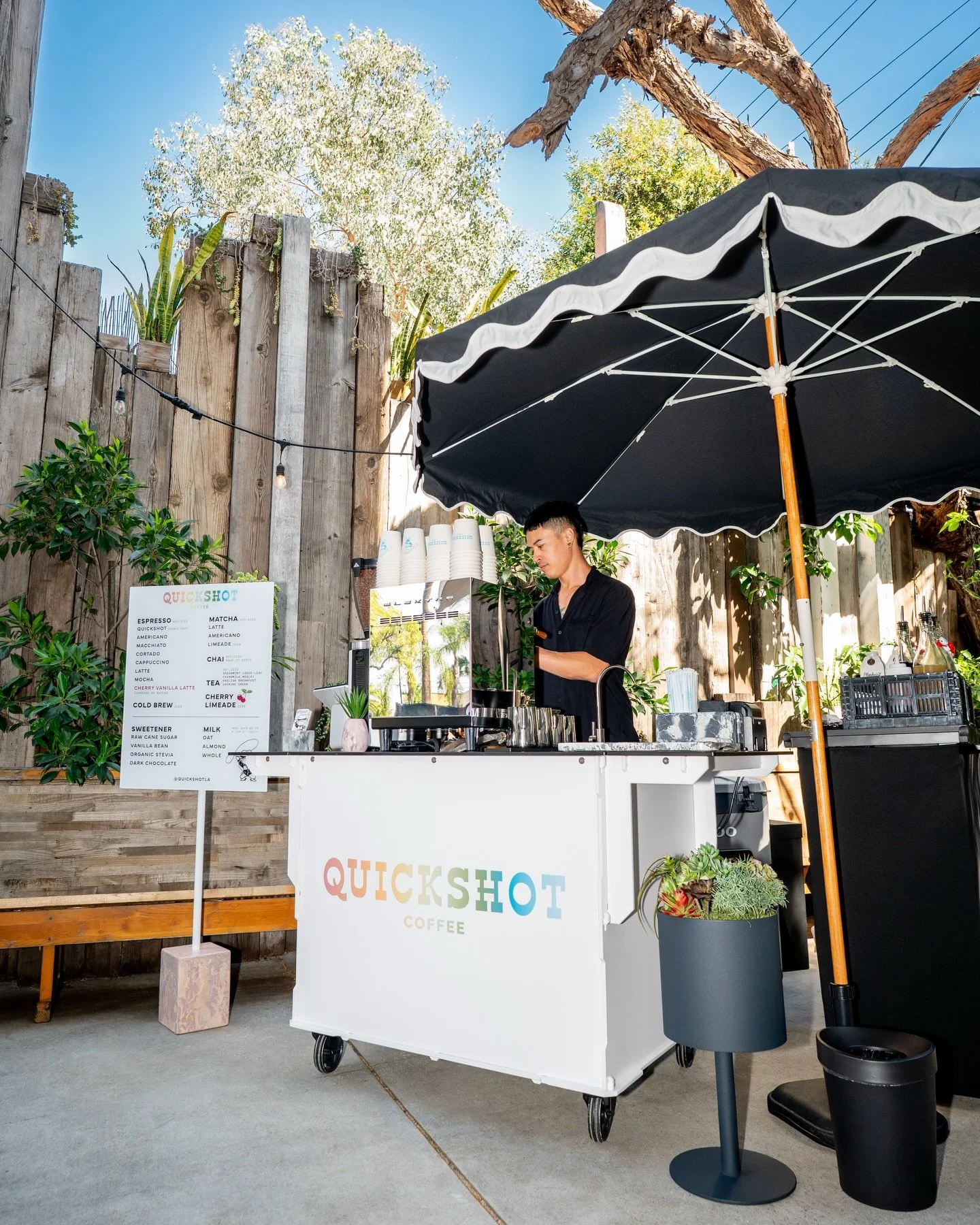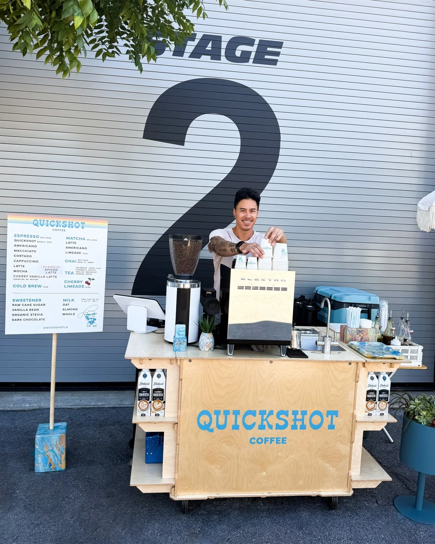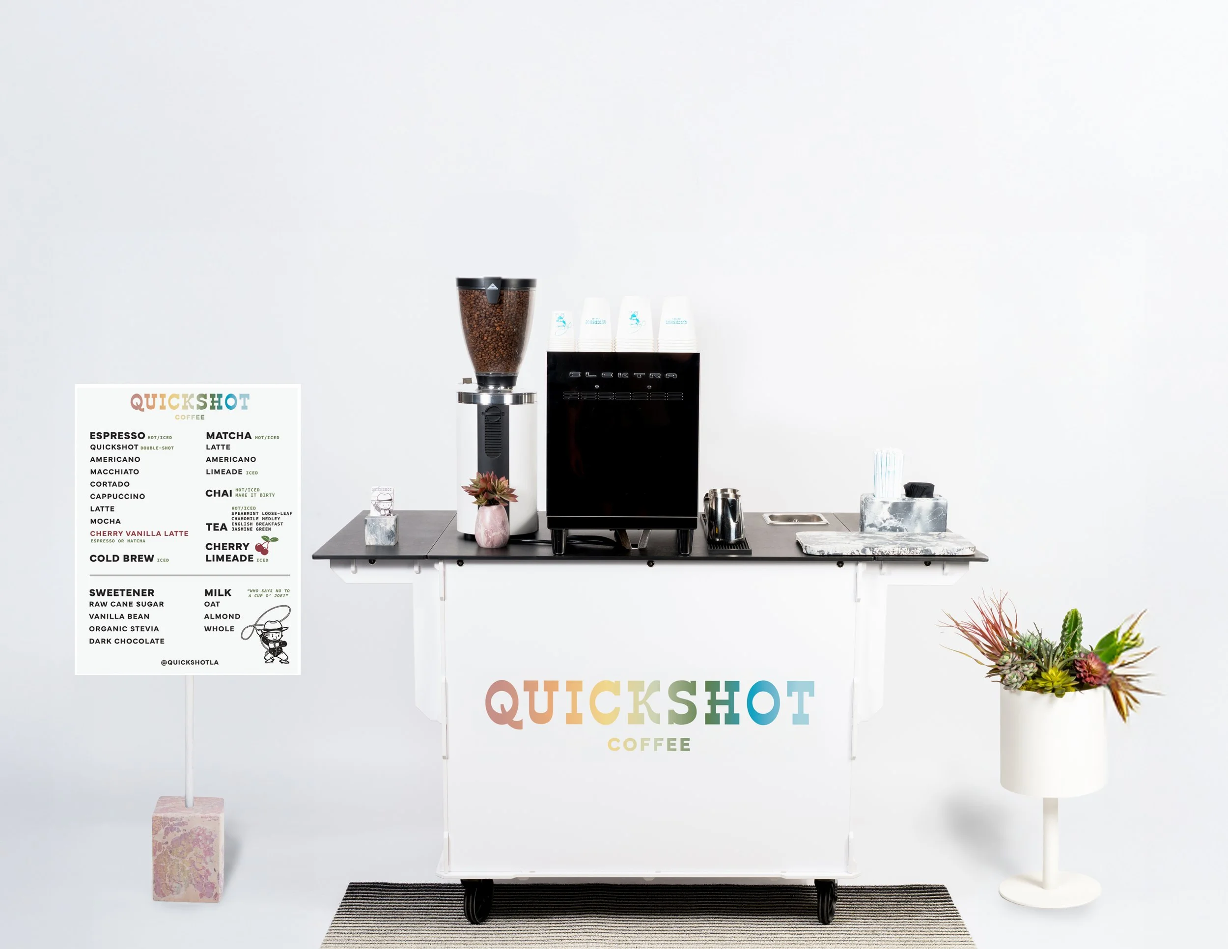 FOUNDED IN 2022, MASON AND ELLIOT CREATED QUICKSHOT COFFEE, A SPECIALTY BARISTA SERVICE BORN FROM A MUTUAL LOVE OF HOSPITALITY AND CAFFEINE. THEY MET IN SUMMER 2020, BECOMING PARTNERS IN LIFE, AND SOON AFTER IN BUSINESS. QUICKSHOT IS THEIR COMBINED VISION, HAVING WORKED IN RESTAURANTS AND COFFEE SHOPS FOR OVER A DECADE. QUICKSHOT AIMS TO DELIGHT, PROVIDING A FULL-SERVICE CAFE EXPERIENCE ON-THE-GO. MASON AND ELLIOT GUARANTEE BIG SMILES, SUPERIOR ATTENTION TO DETAIL, IMPECCABLE SERVICE, EYE-POPPING DESIGN, AND “THE BEST COFFEE IN THE WEST!”